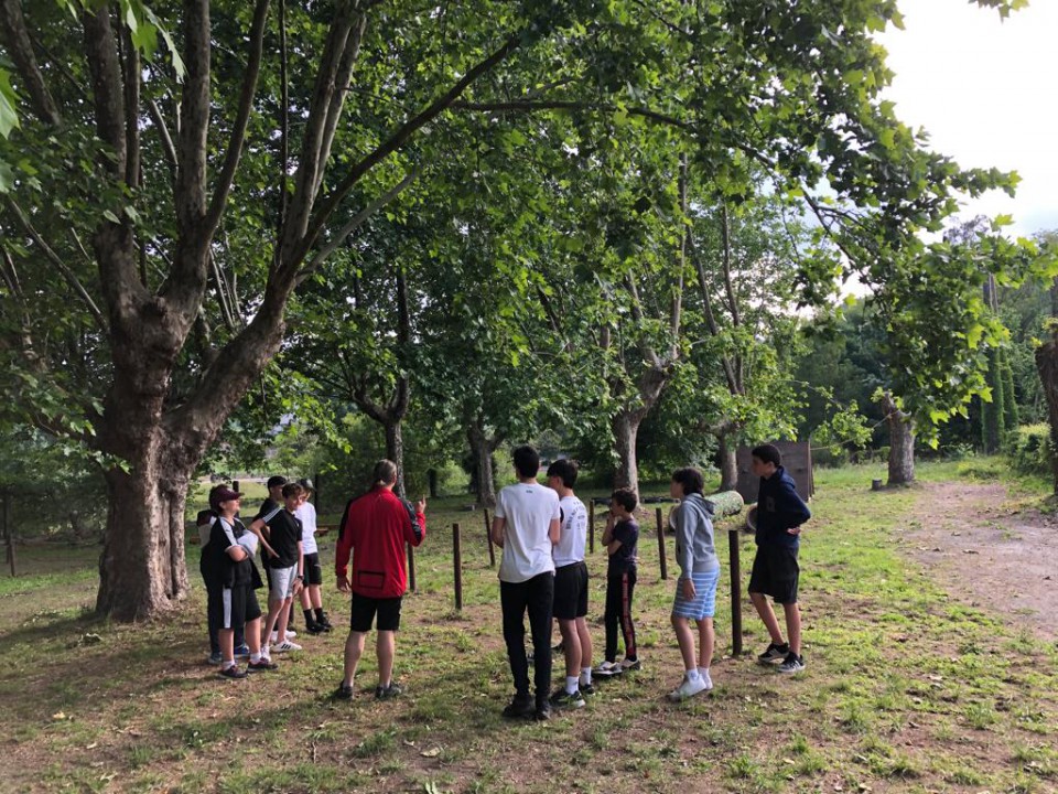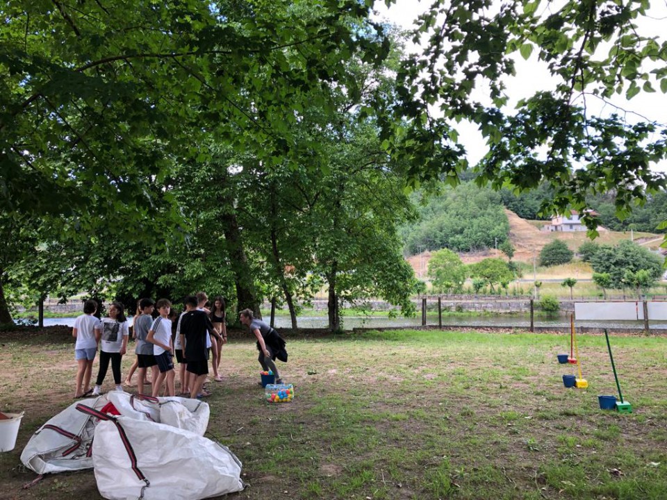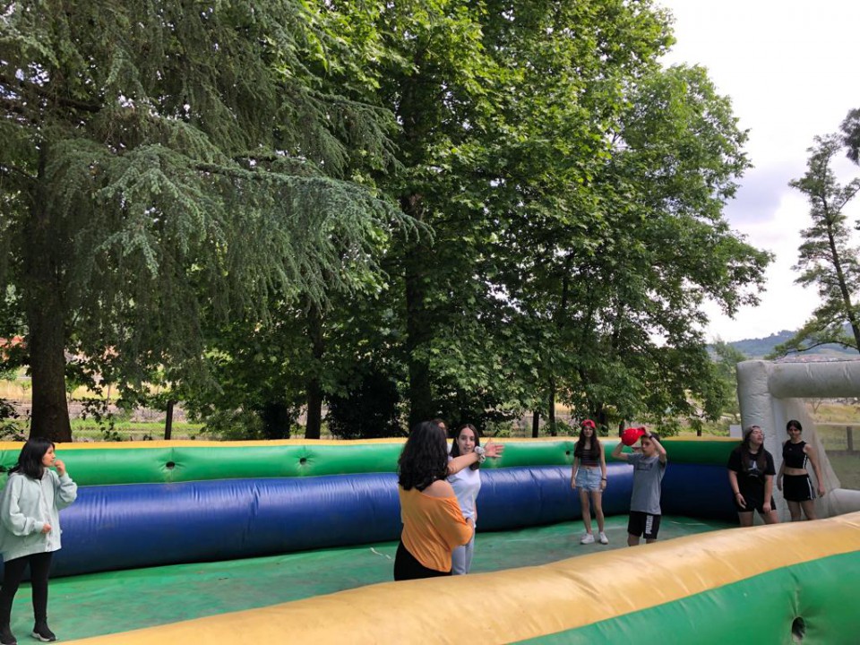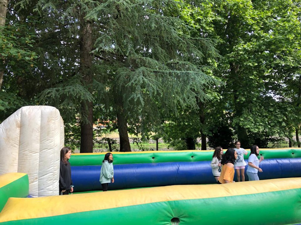 Excursión de 1º de la ESO al camping de Leiro, con actividades como el toro mecánico, futbolín humano, pista americana, tiro con arco, lucha de hinchables, canoas, juegos de agua...
