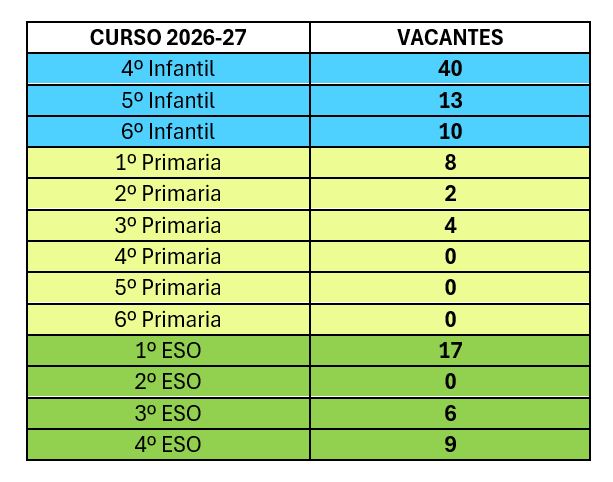 En la fecha de publicación las vacantes son PROVISIONALES y están sujetas a modificaciones en el caso de que algún puesto escolar sea ocupado durante el plazo extraordinario de escolarización del presente año académico 2025/26.