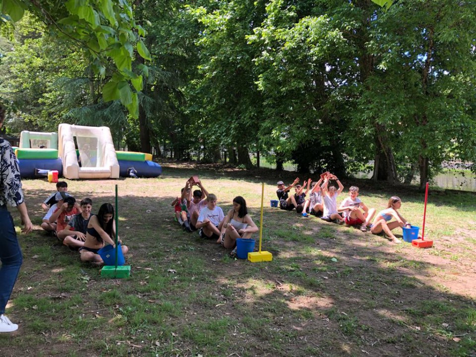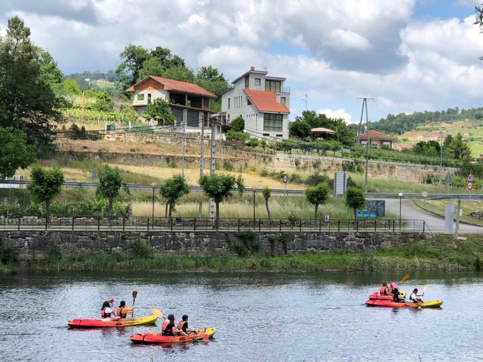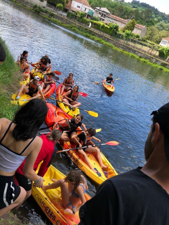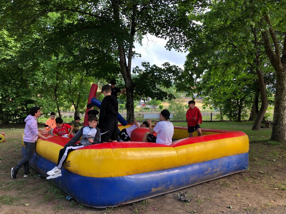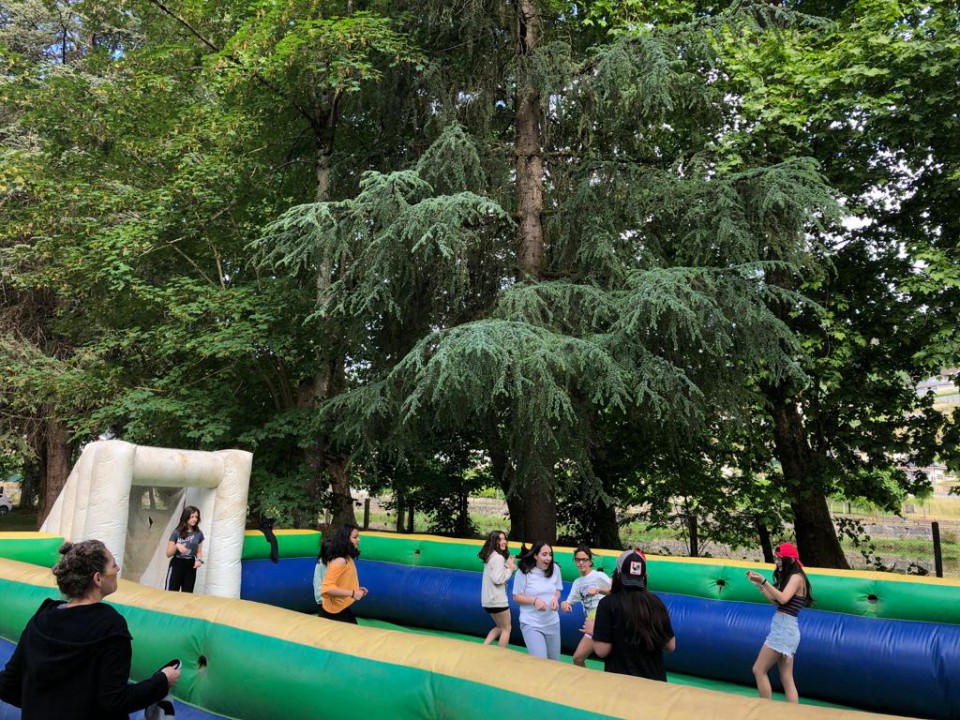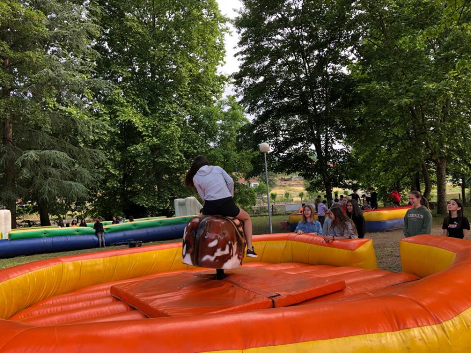 Excursión de 1º de la ESO al camping de Leiro, con actividades como el toro mecánico, futbolín humano, pista americana, tiro con arco, lucha de hinchables, canoas, juegos de agua...